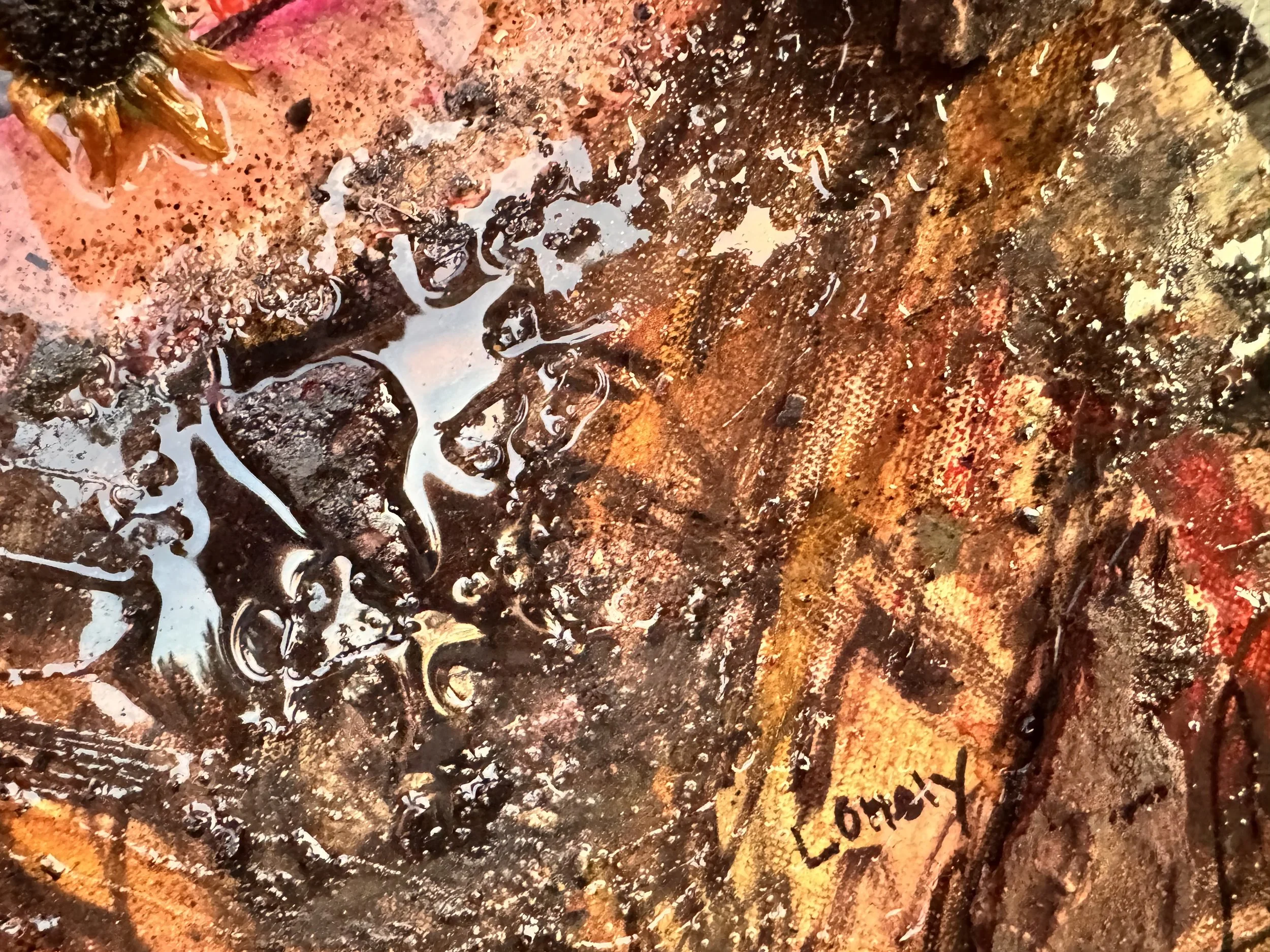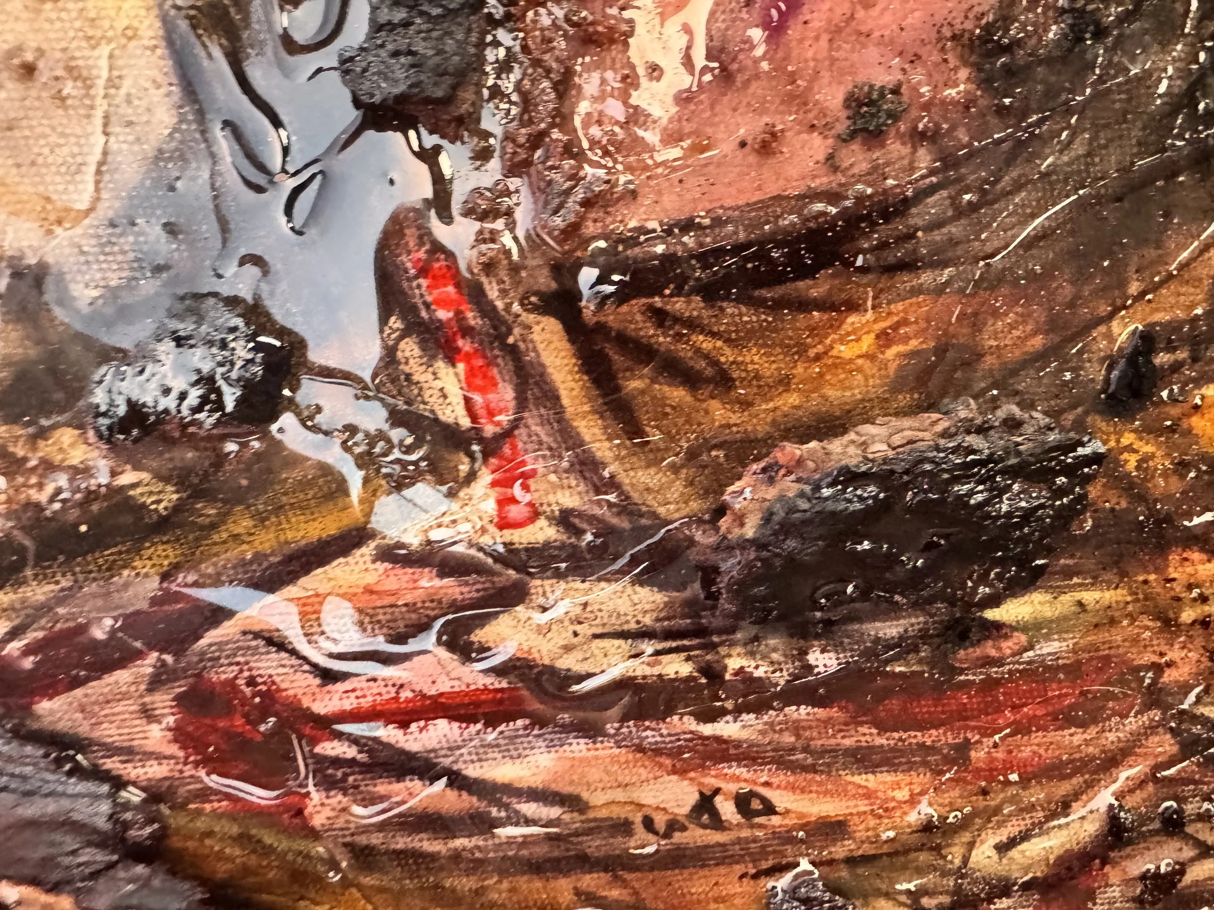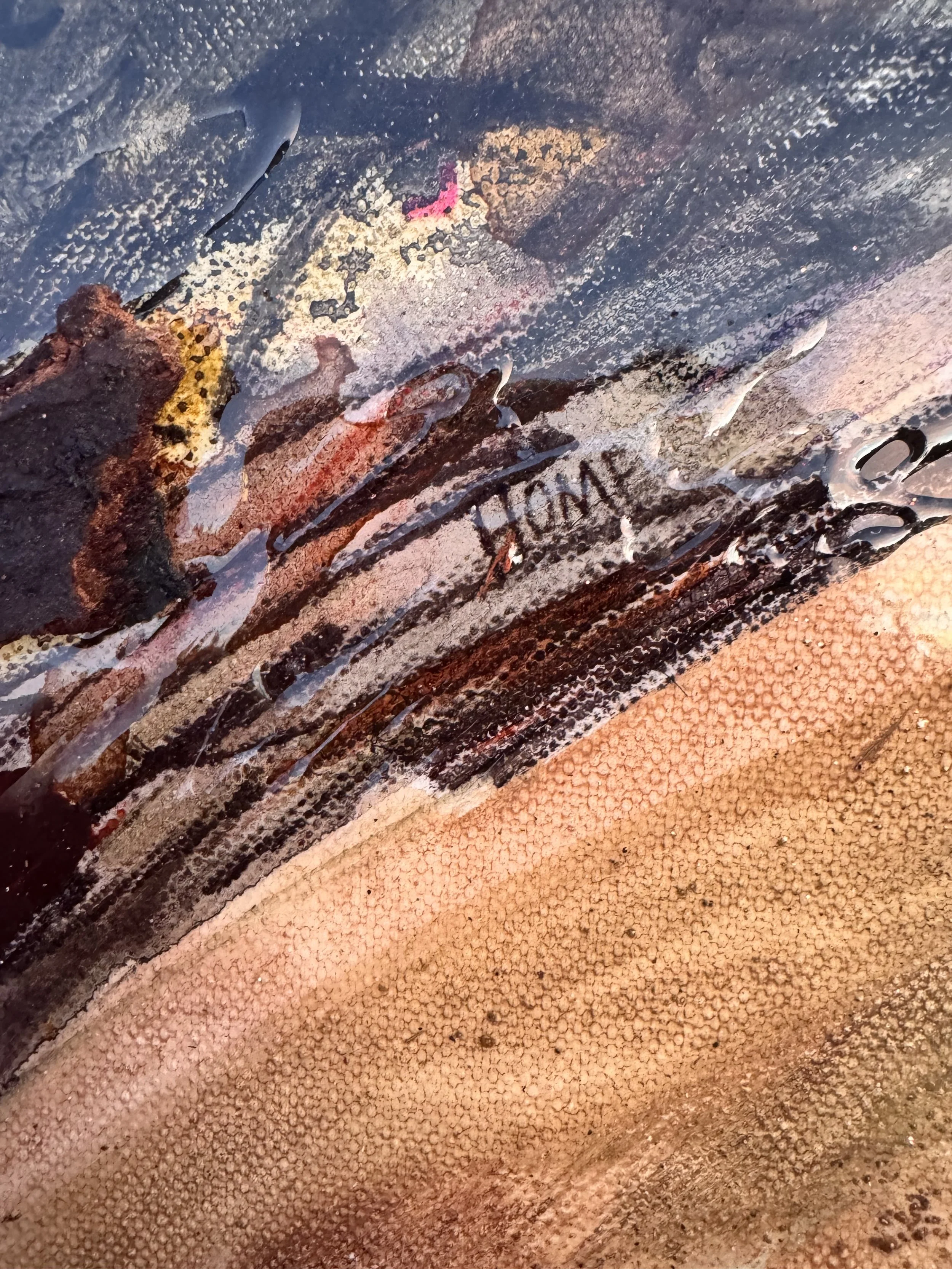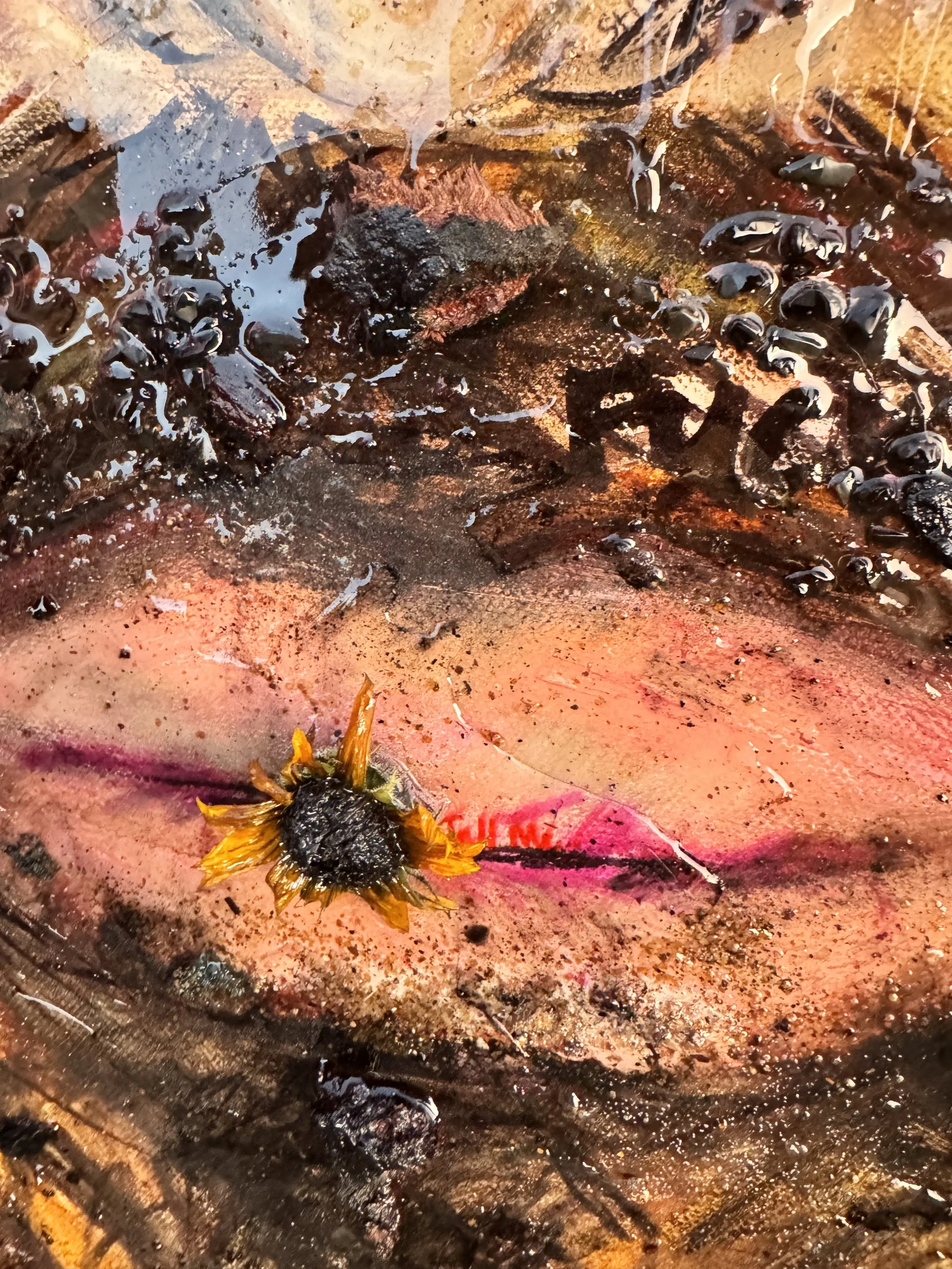 Mixed Media, Oil & Acrylic with California Sand, Burnt Bark, and Charcoal on Canvas in a custom wood frame