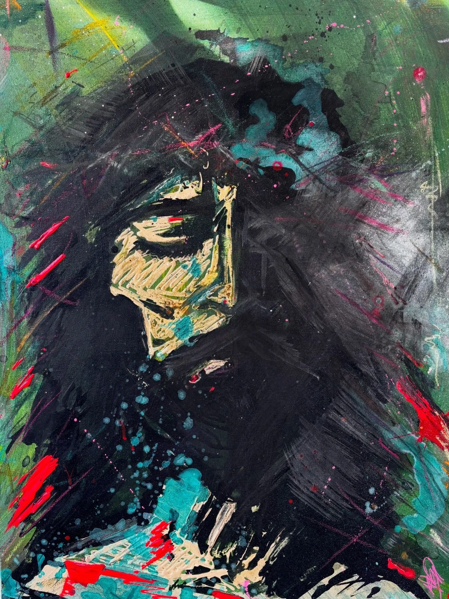 The crowned figure emerges through layered darkness and fractured color, holding both suffering and control.