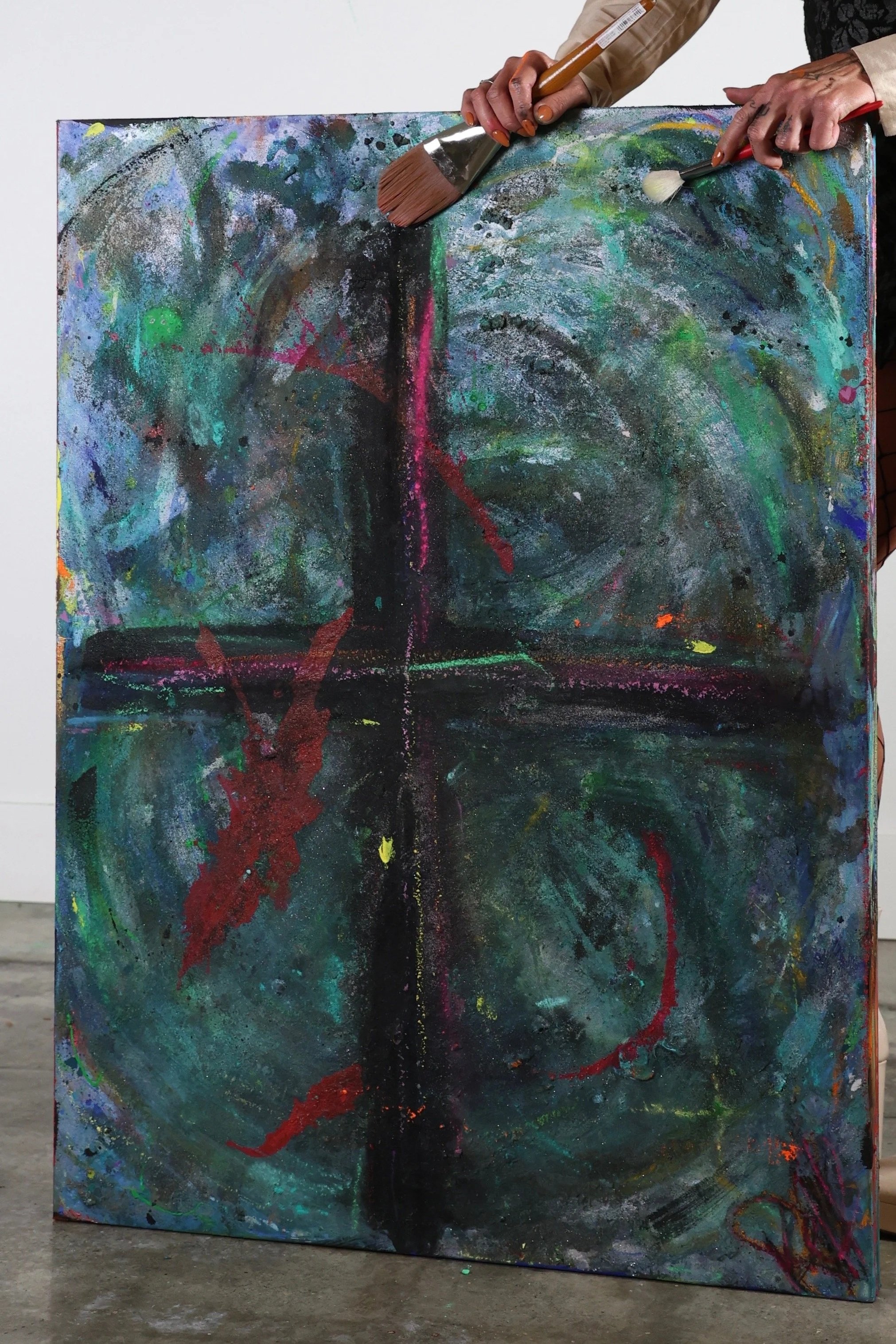 The central cross anchors the composition, surrounded by layered movement and fractured color.